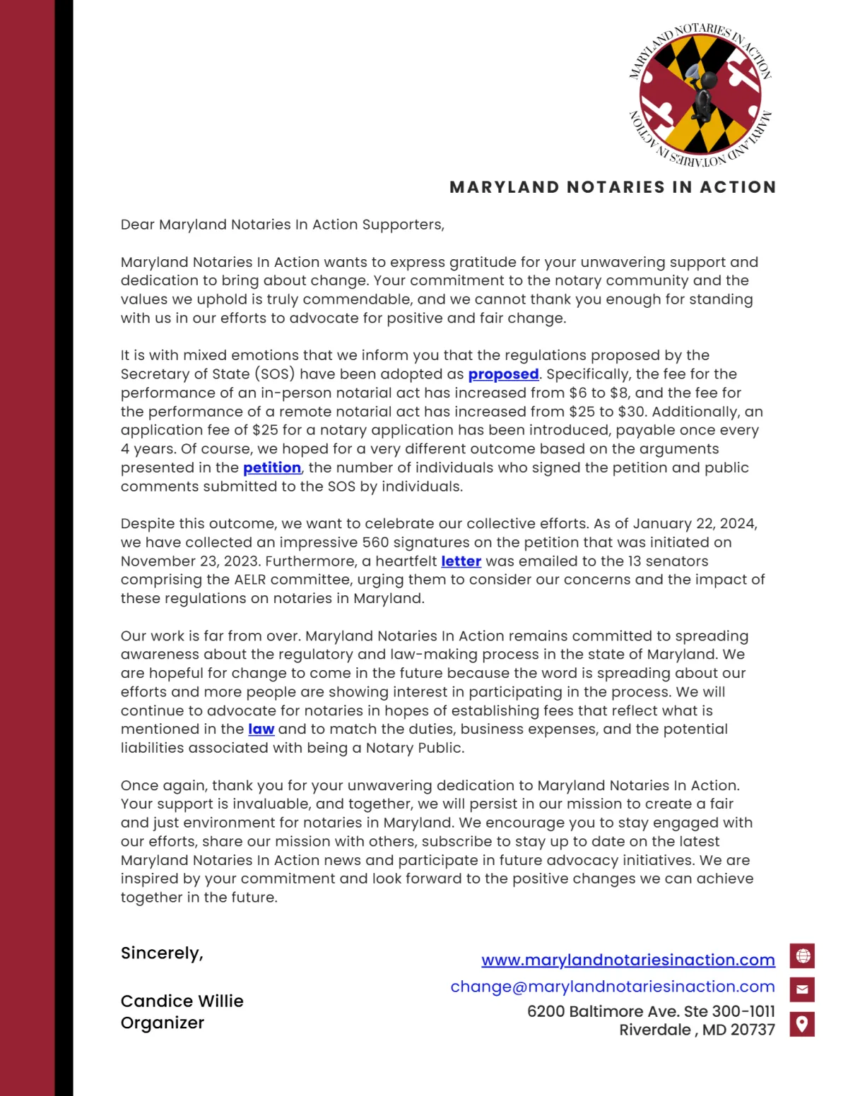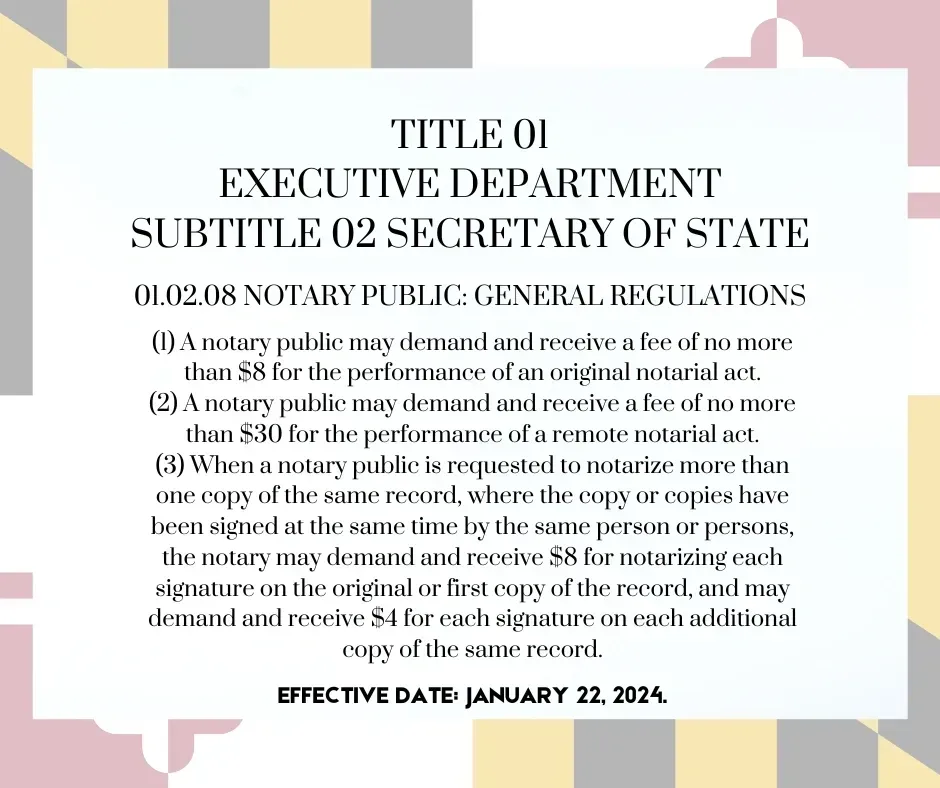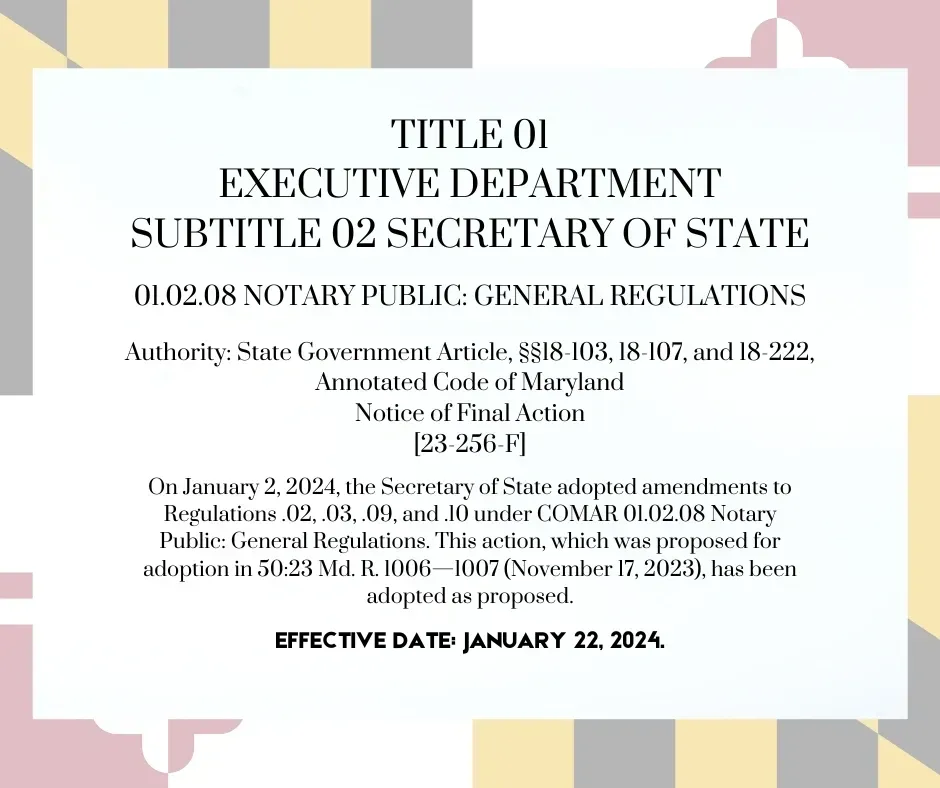 On January 12, 2024, the Division of State Documents announced the new Notary Public General Regulations will be in effect as proposed starting January 22, 2024. These updated regulations include changes to in-person and remote online notarial fees and the application fee for Notary Publics.